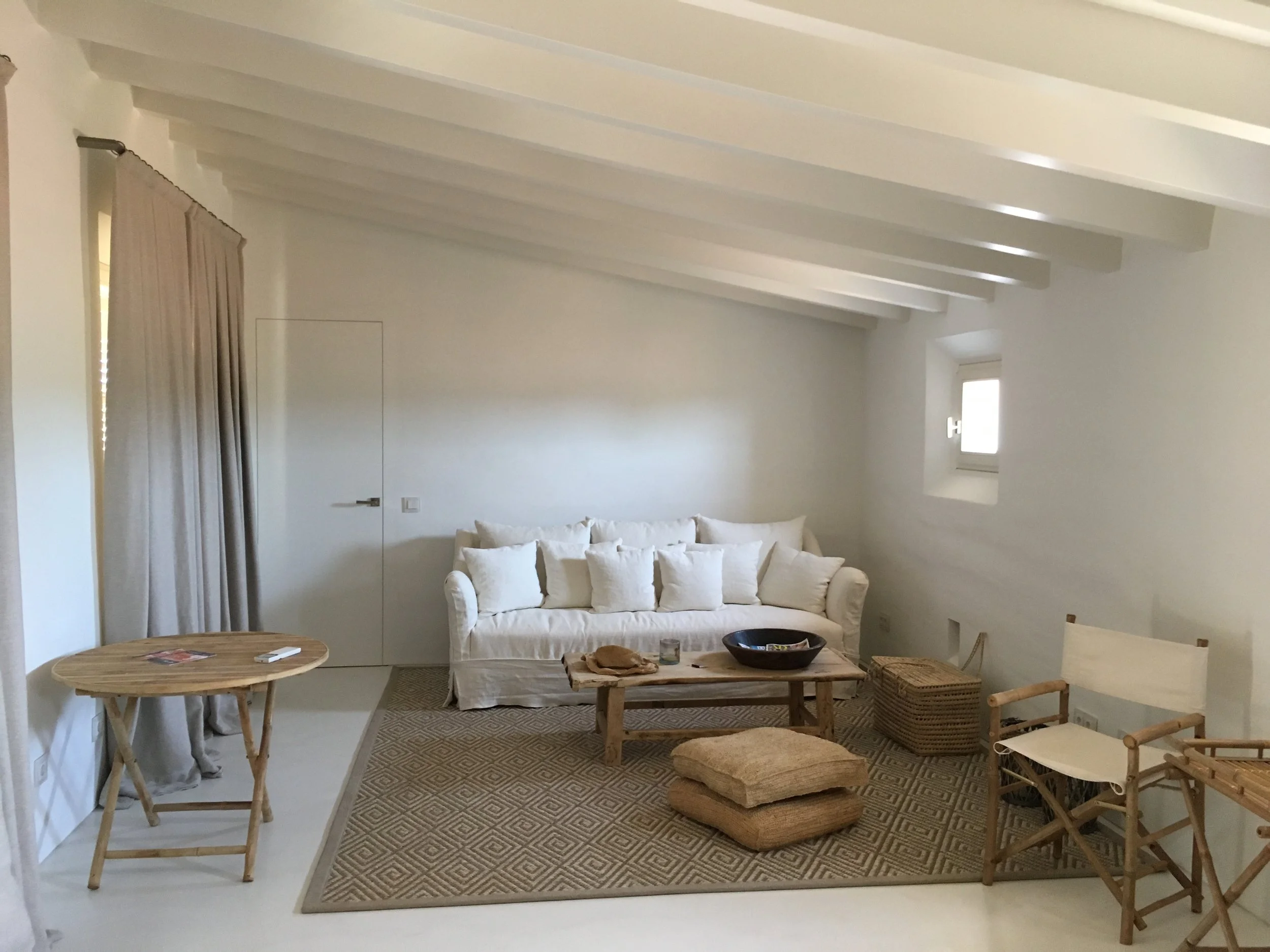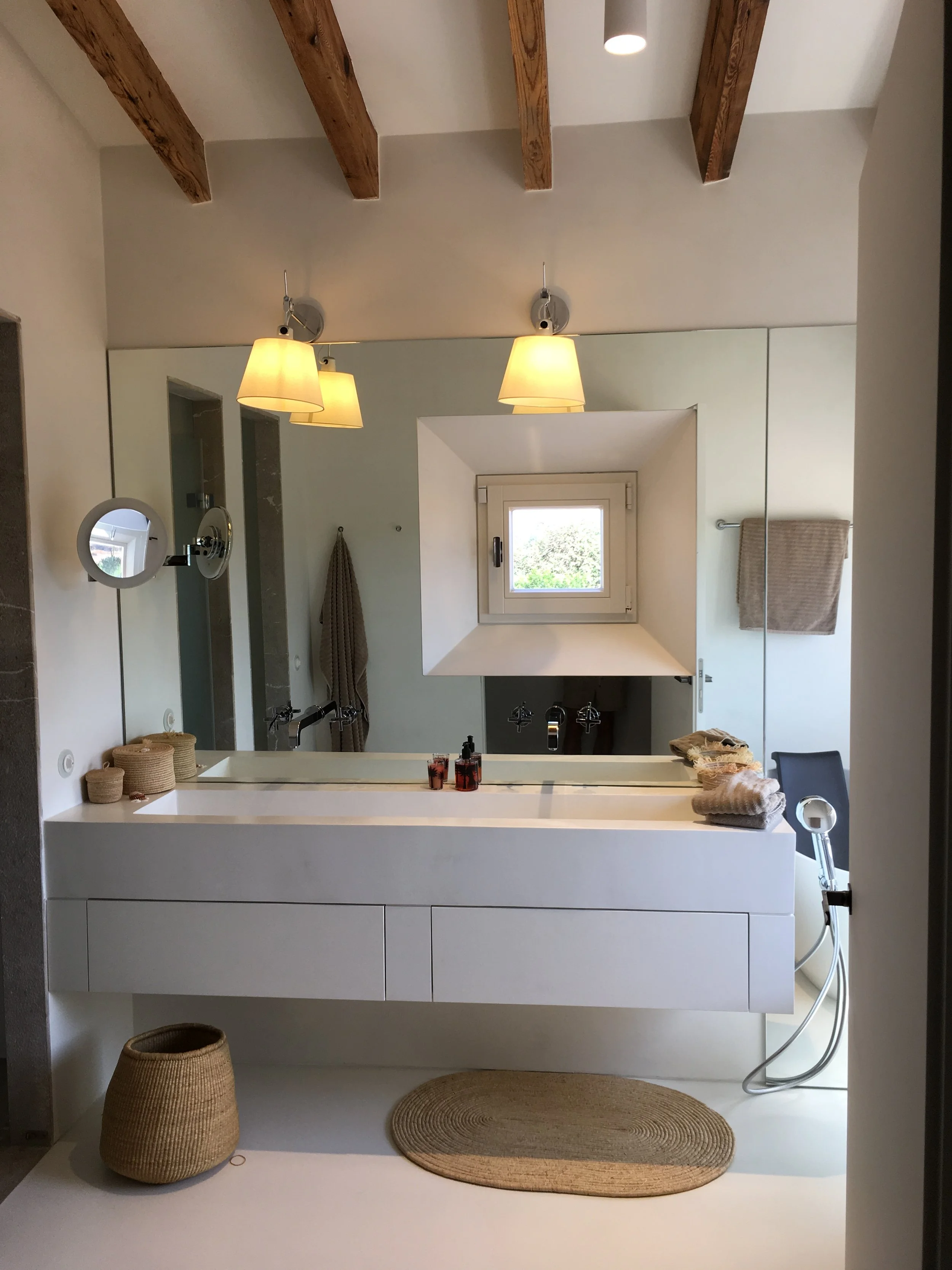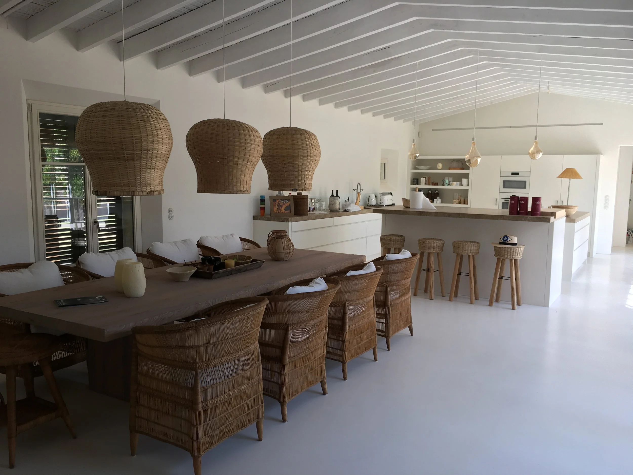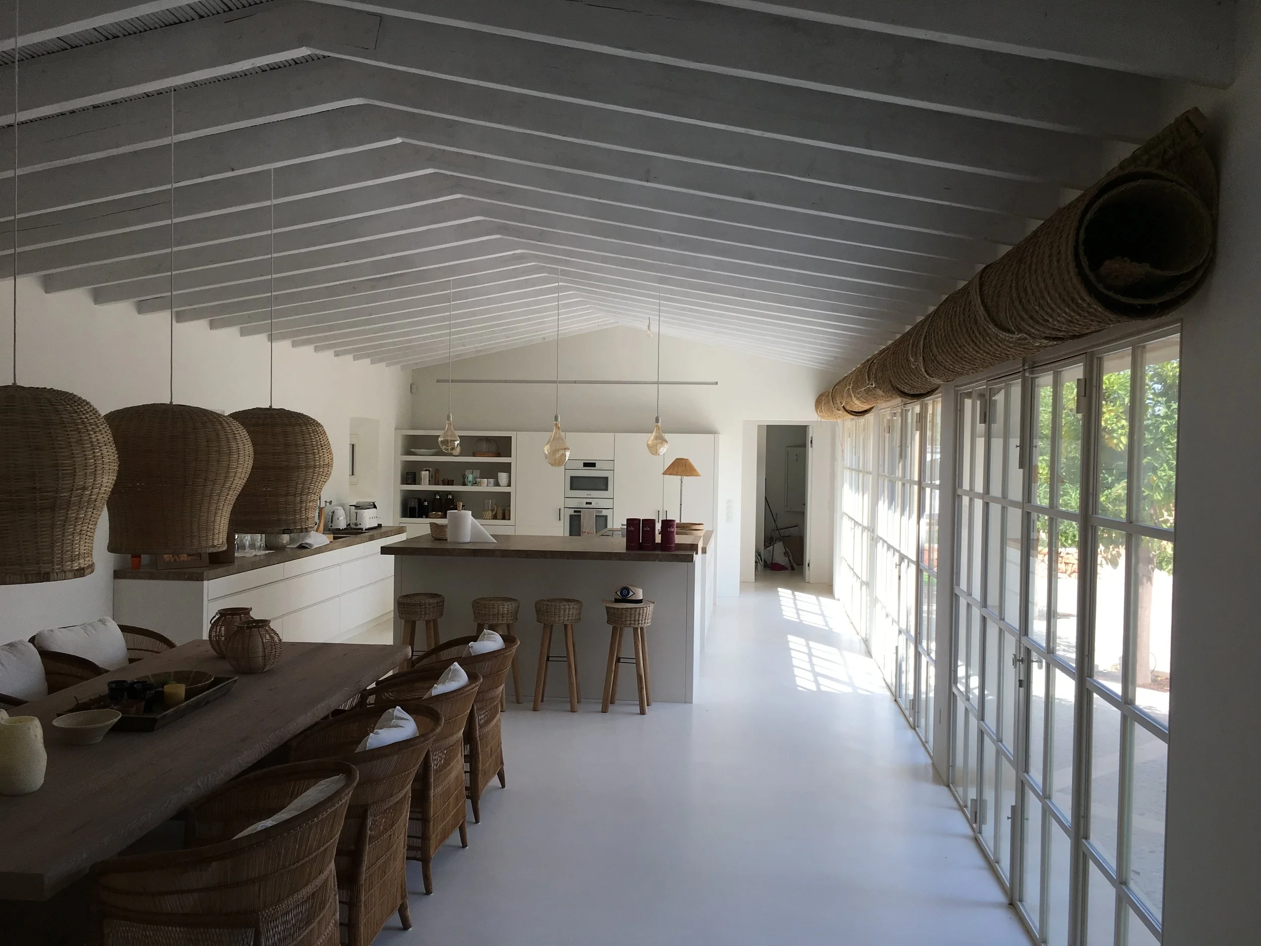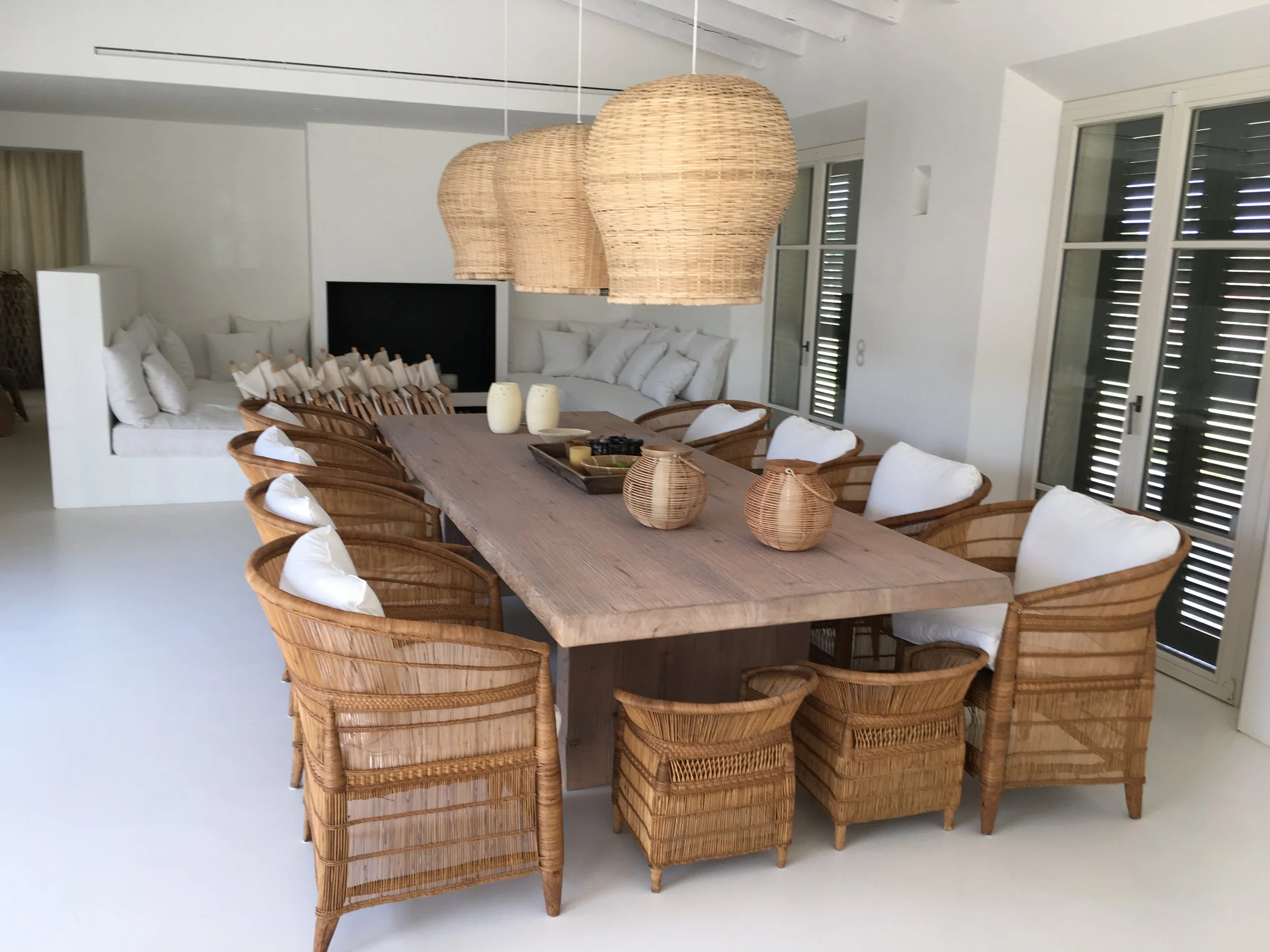 Todo el mobiliario hecho a medida. Sofa, sillería, muebles de exterior y la espectacular mesa de comedor realizada en madera de roble maciza.