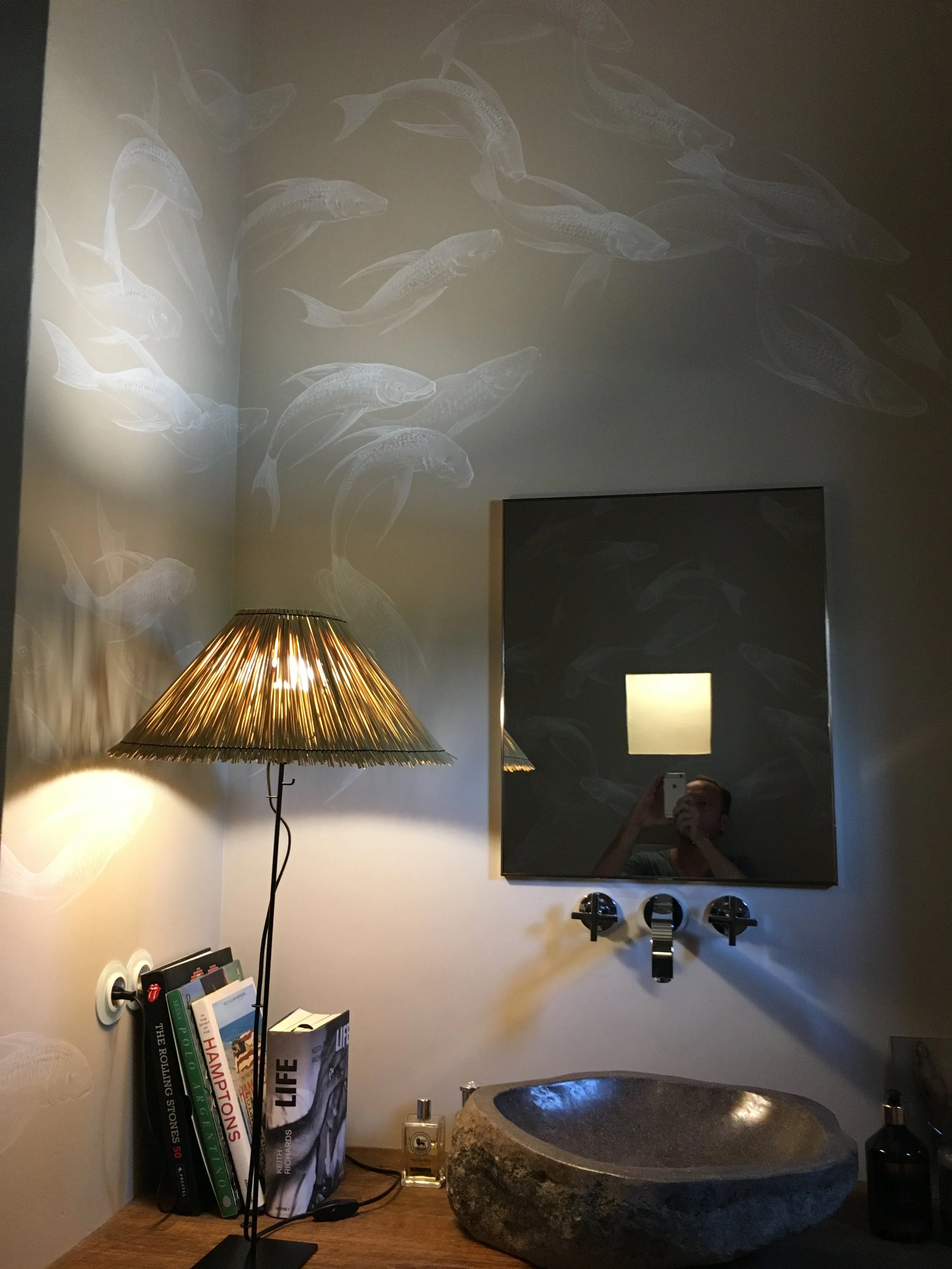 Todo el mobiliario, cortinas y tapicería realizados a medida. Espectacular pintura decorativa de temática de peces en el aseo de invitados.